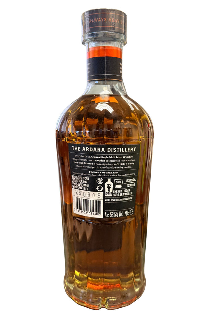 Produced using heavily peated malted barley (55ppm) and the distillery’s signature “all grain in” triple distillation, every drop begins its journey in the Ardara Solera vat, ensuring remarkable consistency and continuity across batches. The whiskey then matures in American bourbon and virgin oak casks, developing the rich, smoky complexity that defines the Ardara style.
