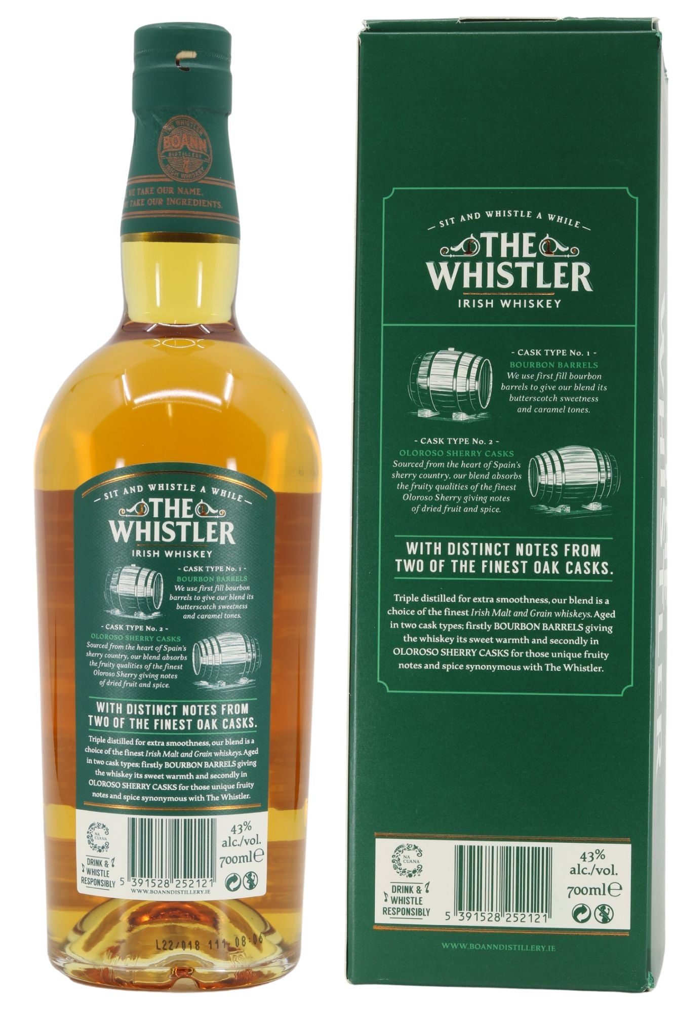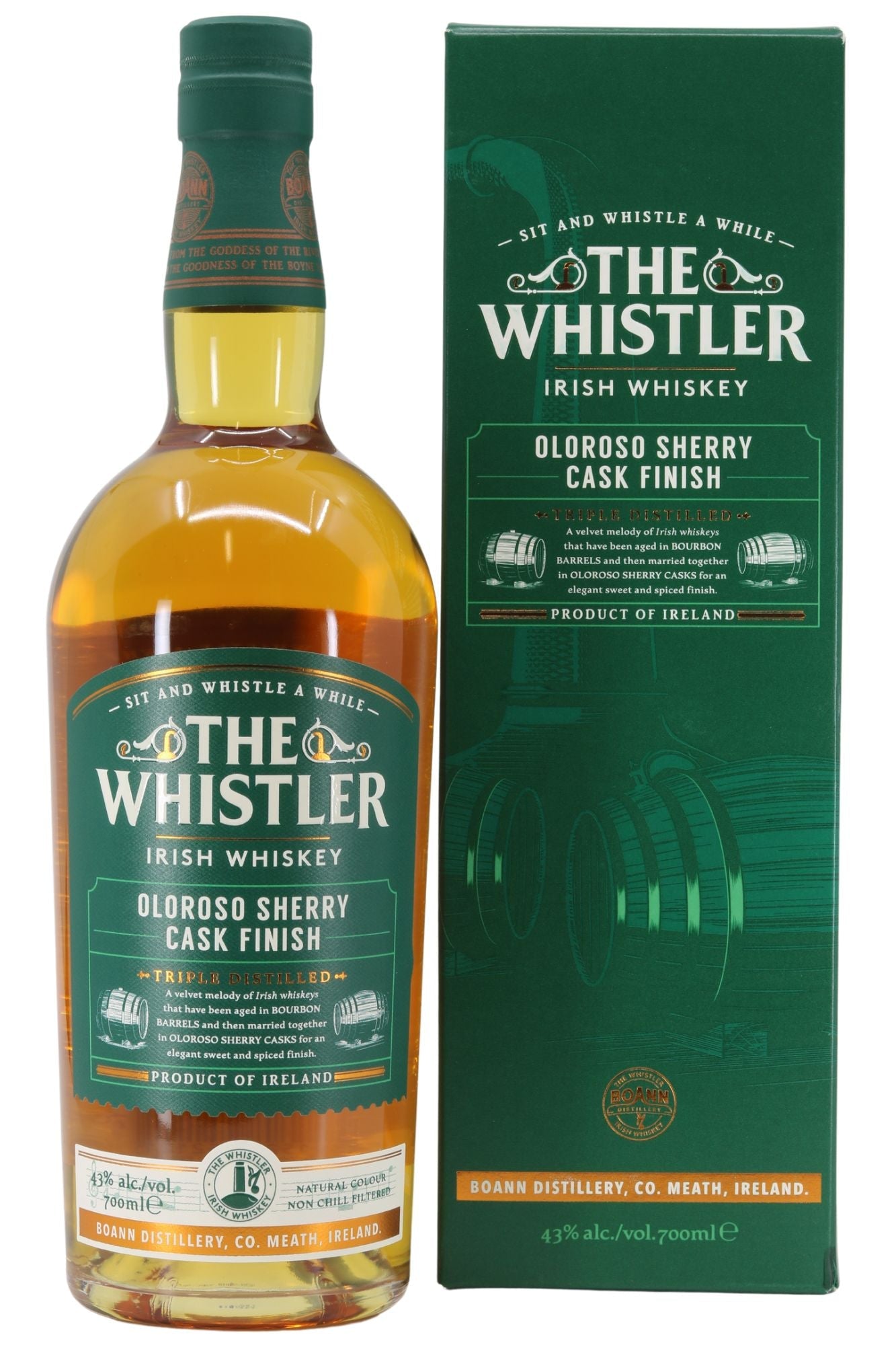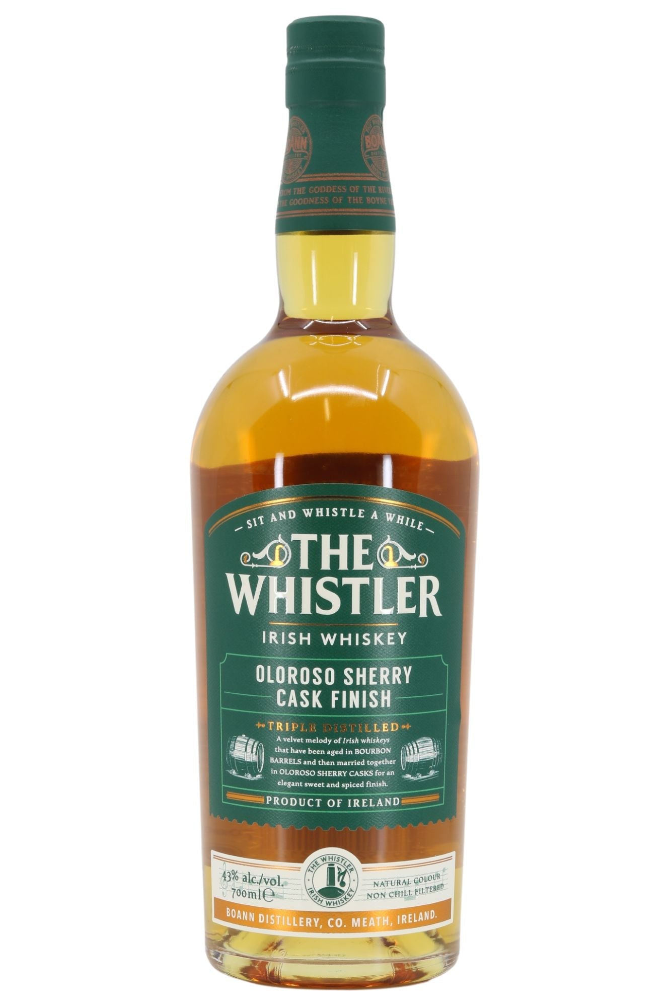 Triple distilled for extra smoothness, this blend is a choice of the finest Irish malt and grain whiskeys. Aged in two cask types – firstly Bourbon Barrels giving the whiskey its sweet warmth and, secondly, in Oloroso Sherry Casks for those unique fruity notes and spice synonymous with The Whistler.