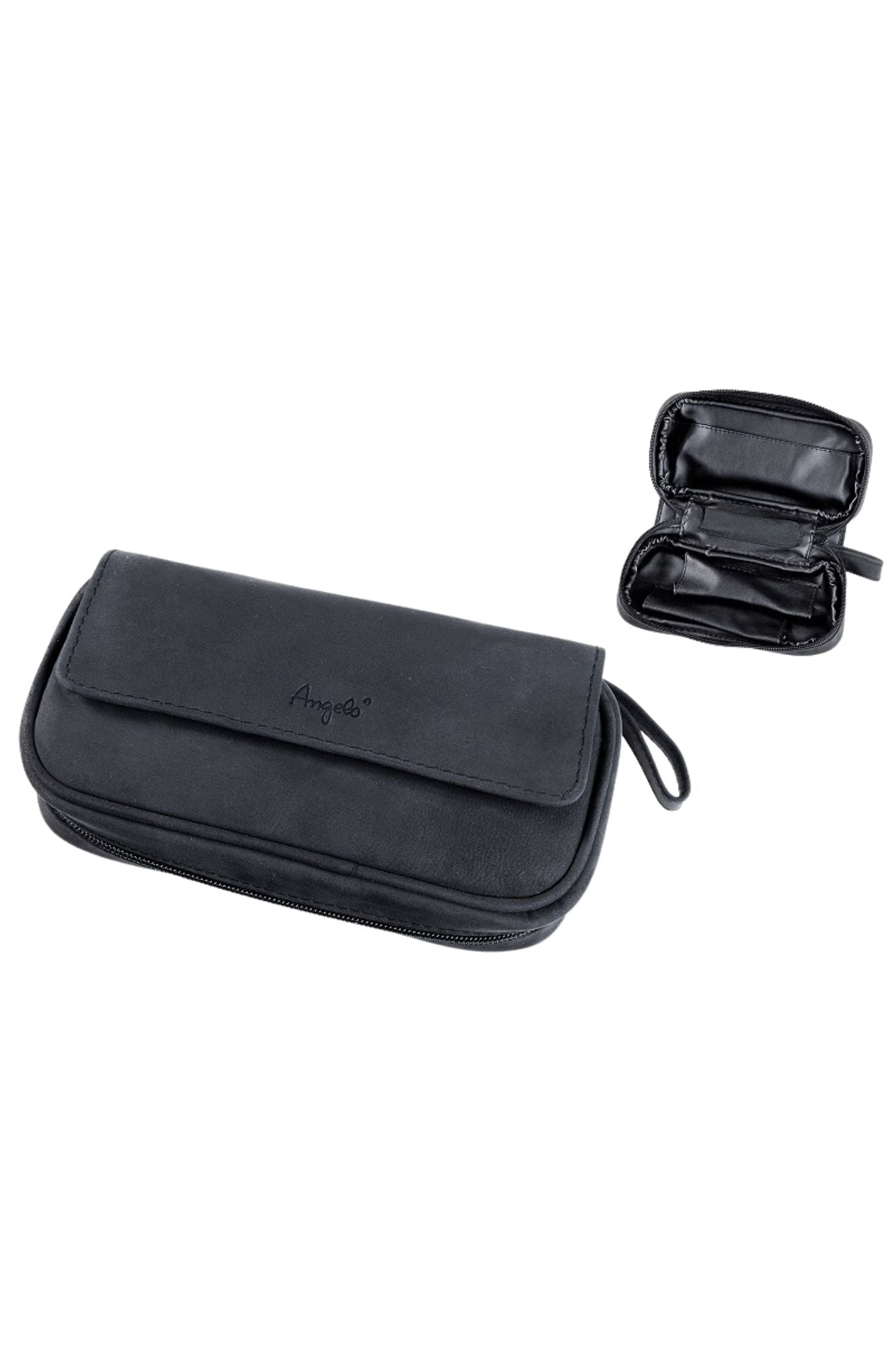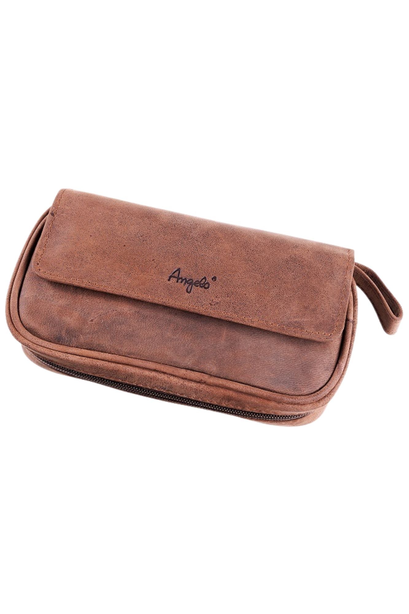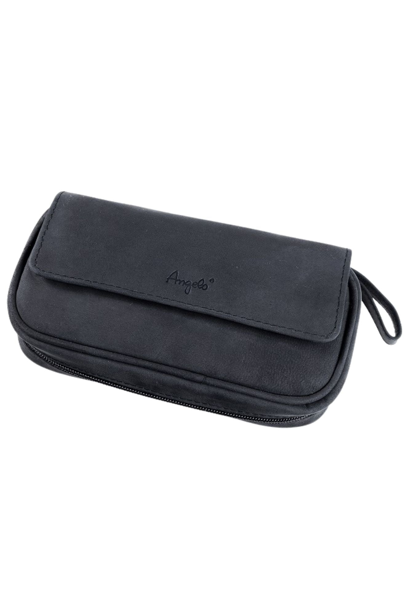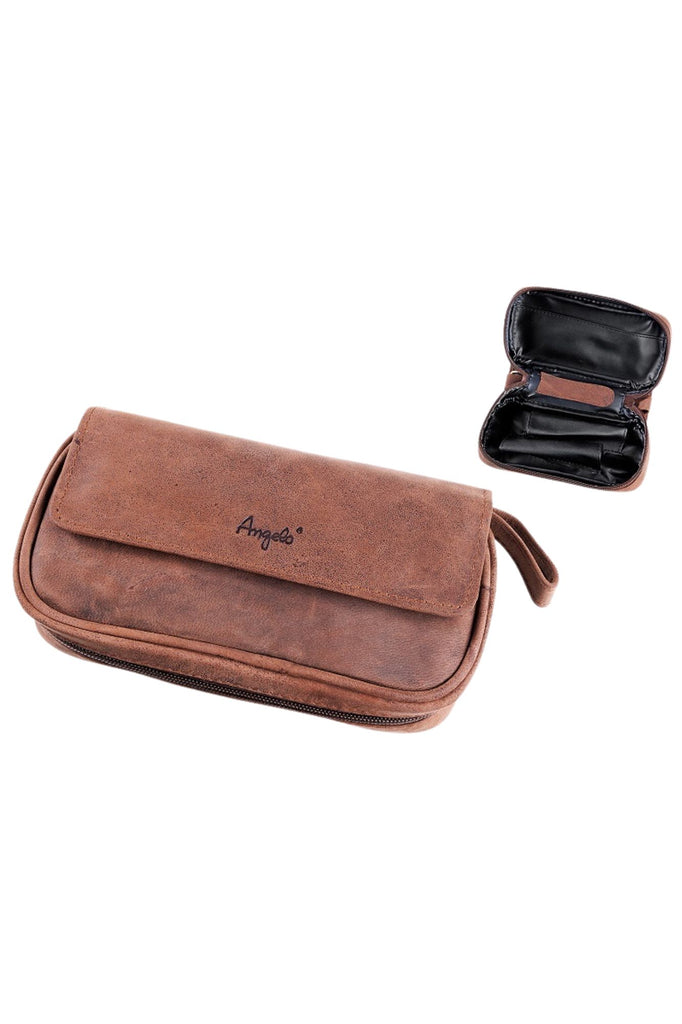 A stylish leather pipe bag with compartments for up to 2 pipes, tobacco and accessories, and a handle strap for ease of carriage.